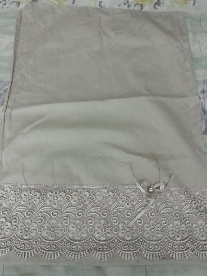 Bej renkte, kenarında çiçek desenli nakış bulunan ve ince fiyonk detayı içeren nevresim kılıfı. Kumaşı yumuşak, gri tonludur. ️