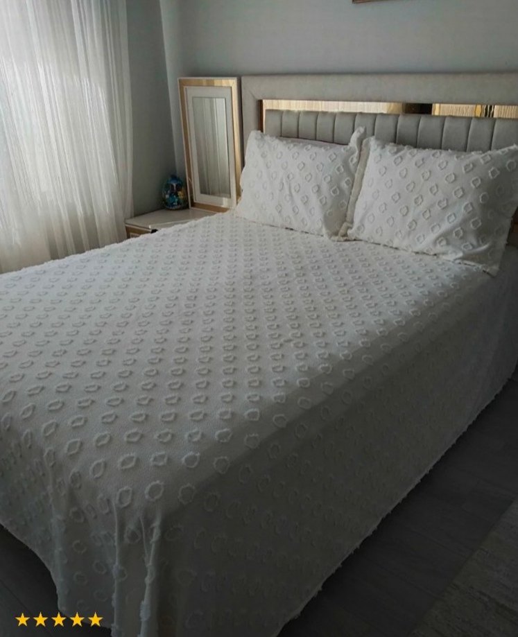 Nakışlı pastel desenlere sahip bej yatak örtüsü, yatak odasına yumuşak ve şık bir dokunuş katıyor.