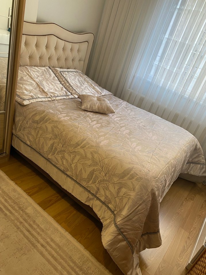 Pastel tonlarda nakışlı desenlere sahip bej yatak örtüsü, yatak odasına yumuşak ve şık bir dokunuş katıyor.