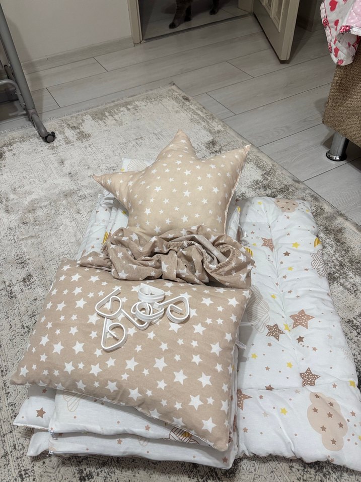 Yumuşak sentetik kumaştan yapılmış, nakışlı yıldız desenlerine sahip bej çocuk uyku seti, yıldız şeklinde yastık ve uyumlu yatak takımı içerir.