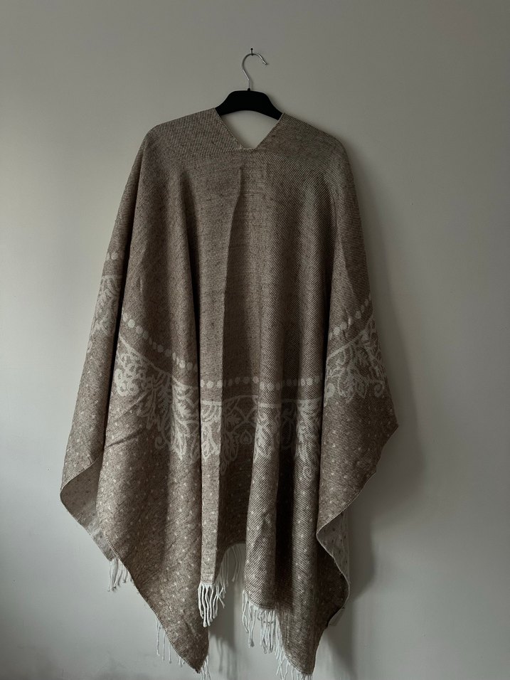 Nakışlı desenlere sahip, uzun ve bol kesim bej yün panço, bohem tarz için uygundur. Standart beden