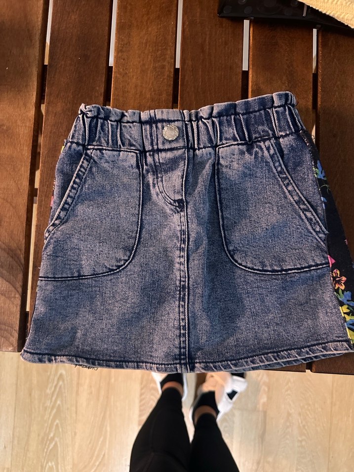 kot kumaştan yapılmış, nakışlı ve bel bantlı kız etek. Gri-mavi tonlarında, sokak stiline uygun cepli tasarım.sorunsuz