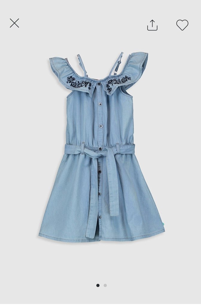 Nakışlı detaylara sahip, askılı ve straplez yaka mavi kot kumaştan bol kesim kız elbisesi, bel bantlı ve düğmeli önde.