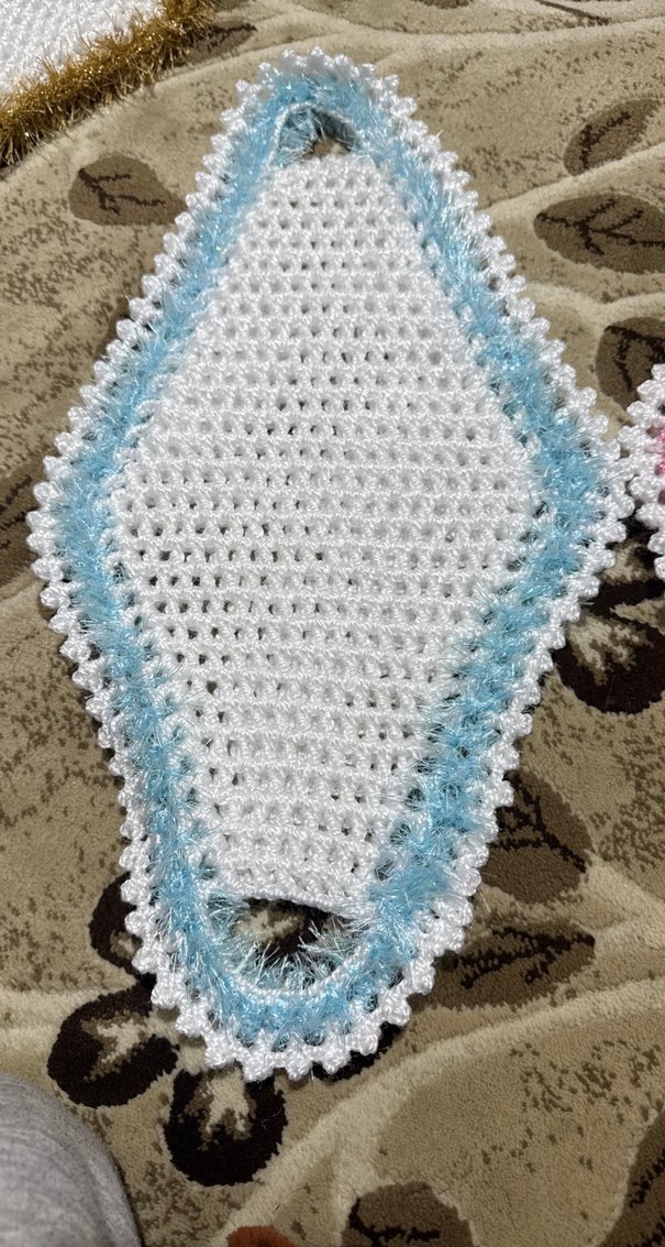 Nakışlı desenli beyaz lifi, açık mavi kenarlıkla çevrilmiş, yumuşak ve nefes alan dokuda.