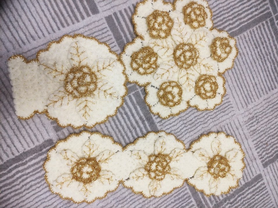 Nakışlı beyaz banyo paspasları, altlarında gri desenli zemin ile birlikte yumuşak dokulu ve altın renkli çiçek işlemelidir.