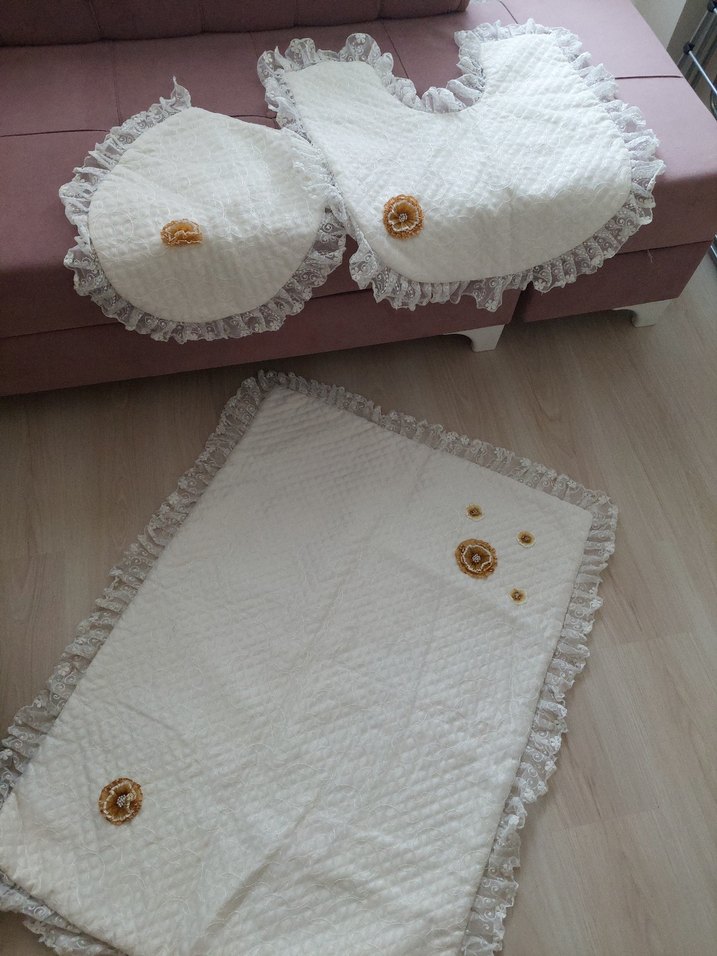 el emeği. hiç kullanılmadı Nakışlı çiçek detayları ve dantelli kenarlarıyla beyaz banyo paspası seti, banyonuza zarif bir dokunuş katıyor.