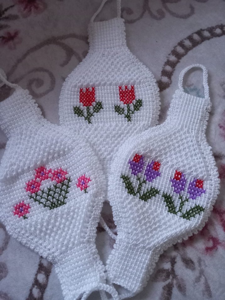 Nakışlı çiçek desenli, beyaz banyo süngerleri. Asma halkaları bulunan, yumuşak dokulu temizlik ürünü.
