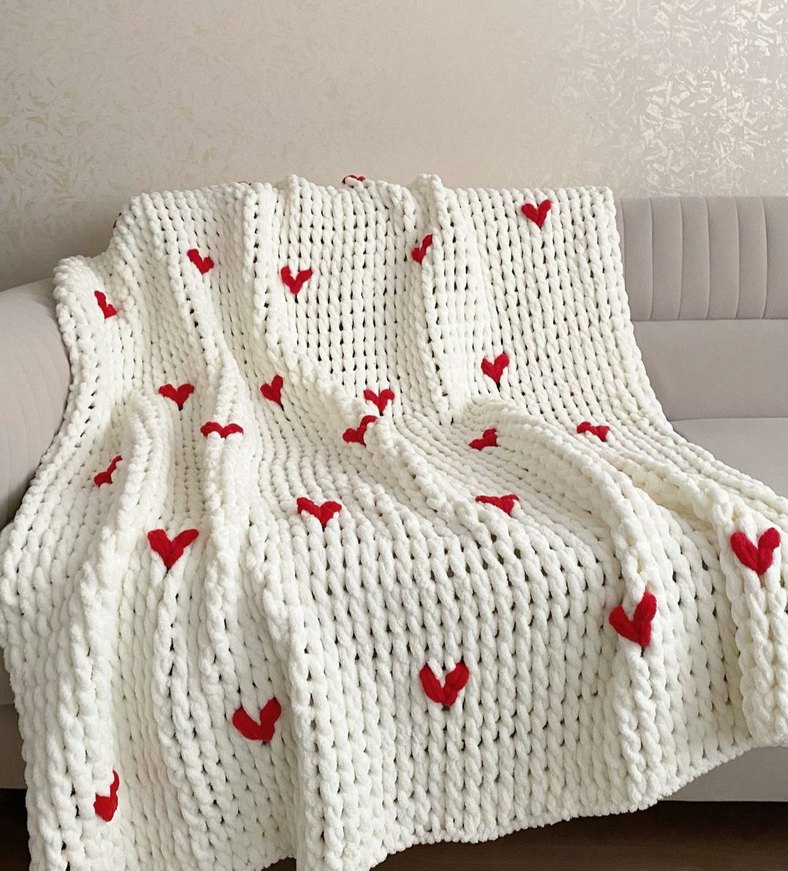 Nakışlı kırmızı kalplerle süslenmiş beyaz battaniye, yumuşak ve kalın örme dokusuyla rahatlık sağlar. ❤️120 *180 ebatındadır tek kişilik