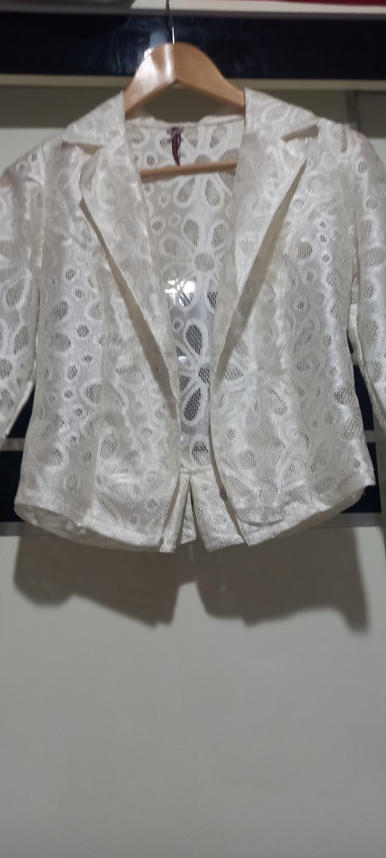 Uzun kollu, yaka detaylı, düğmeli 38 beden beyaz bayab bolero. Sentetik kumaş üzerine işleme detayları bulunur.