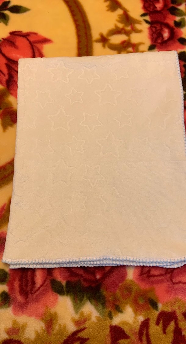 Nakışlı yıldız desenli, pastel beyaz renkte yumuşak ve sıcak bebek battaniyesi.