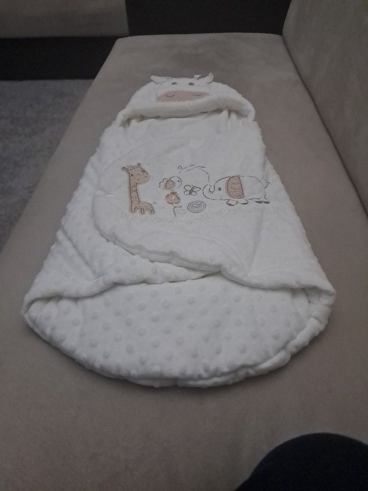 Nakışlı hayvan desenleri ve inek yüzü kapüşonuyla yumuşak beyaz bebek battaniyesi.