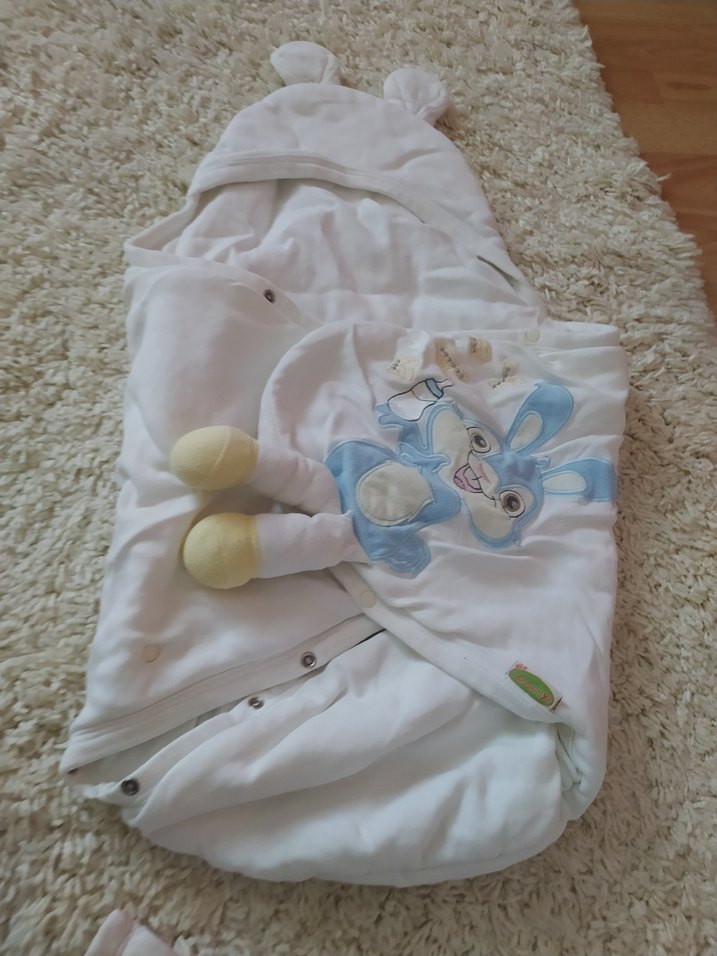 Yumuşak beyaz çocuk battaniyesi, nakışlı pastel tavşan desenli ve kulaklı kapüşonlu, sıcak kumaştan yapılmıştır.