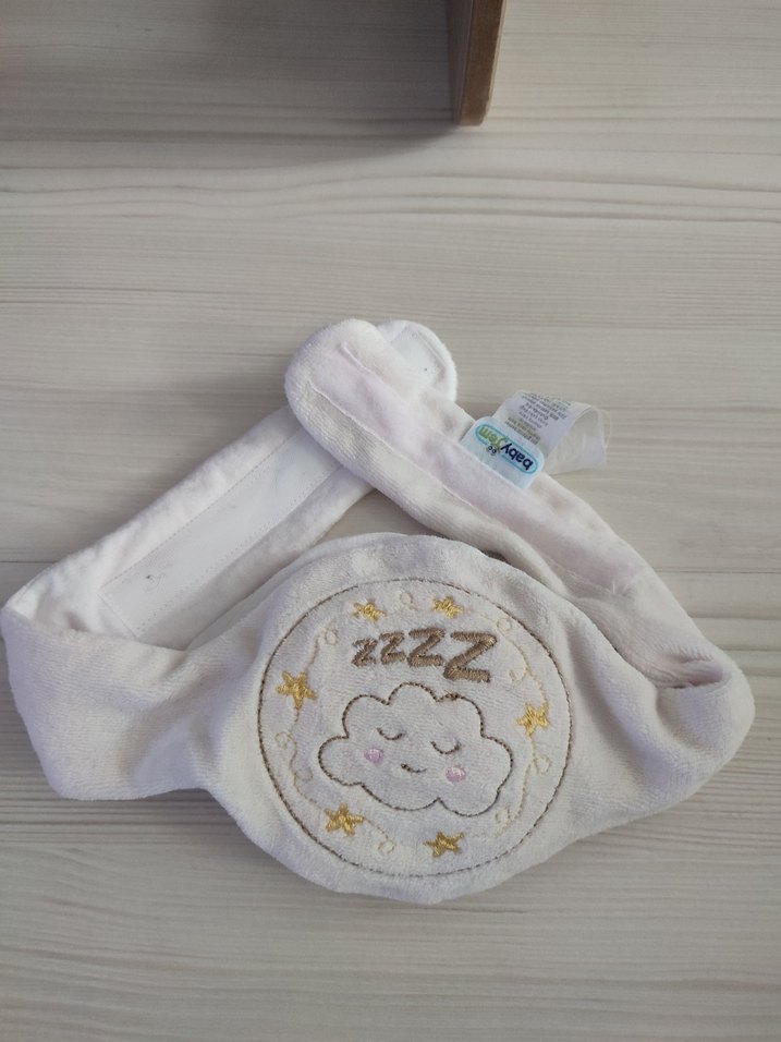 Nakışlı bulut ve yıldız desenli, yumuşak ve sıcak kumaştan yapılmış beyaz bebek kiraz çekirdekli bel kemeri. Çocuklar için nazik konfor sağlar kiraz çekirdekli kolik bebekleri için ve karın ağrısı için idealdir