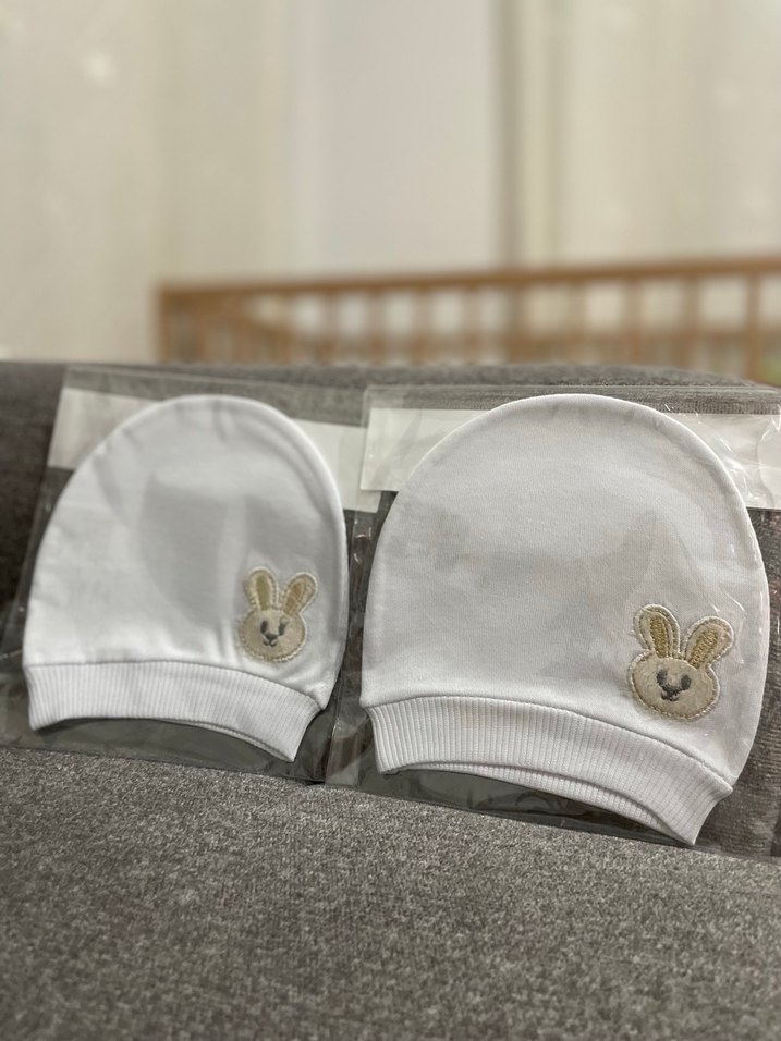 2 adet beyaz bebek bere tanesi 100 ₺ dir. Yumuşak kumaştan, gri nakışlı tavşan figürlü beyaz bebek beresi.