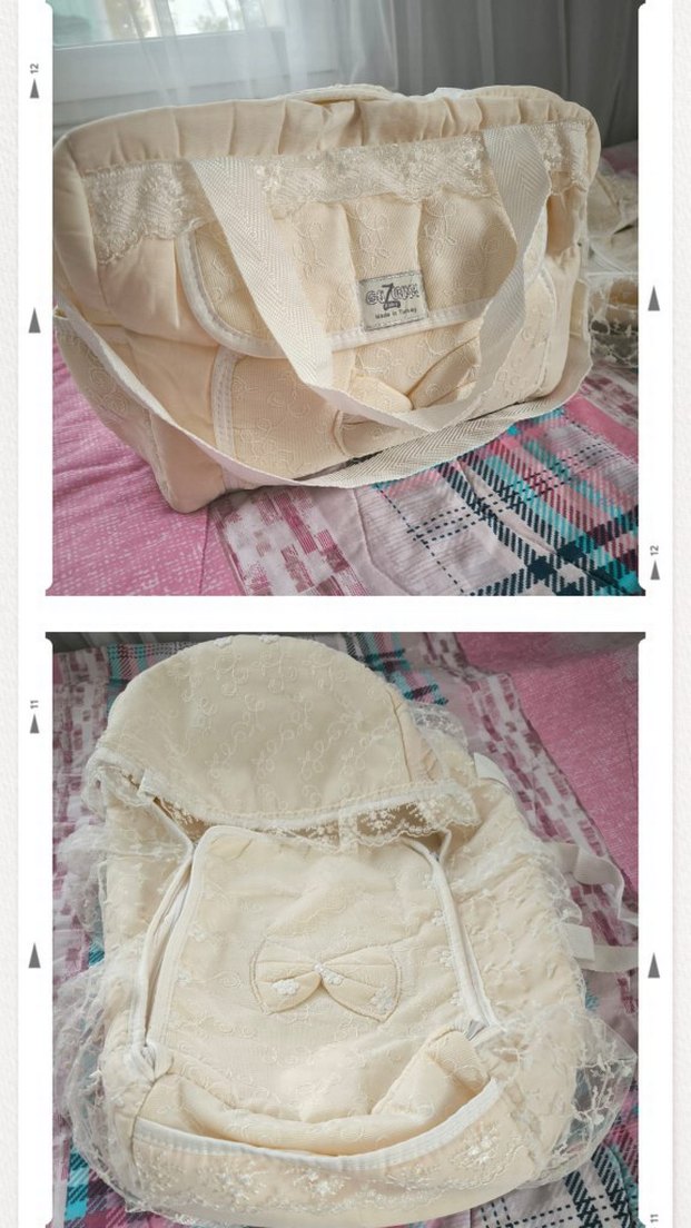 Nakışlı beyaz bebek taşıma çantası ve ana kucağı, yumuşak sentetik kumaştan yapılmıştır. Dantel detayları ve fiyonk süsü bulunur.
