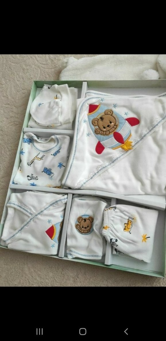 Nakışlı detaylara sahip beyaz bebek hastane kıyafeti seti, kapüşonlu ve yumuşak kürk dokusundadır. Örgü detayları ve askılı kollarıyla bohem tarz sunar.