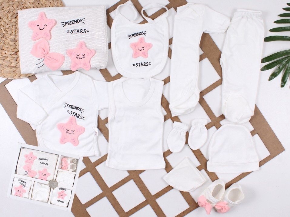 Nakışlı pastel yıldız desenli beyaz bebek hastane kıyafeti seti, önlük, eldiven, pantolon ve üstlerden oluşur, rahat ve şık bir seçimdir.