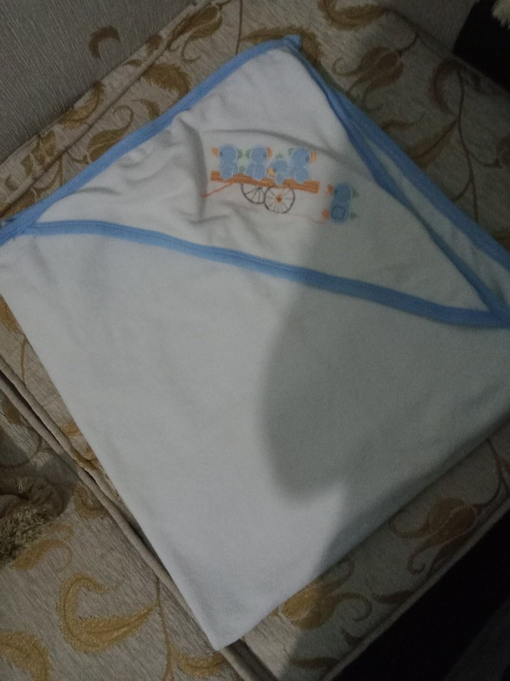 Mavi kenarlıklı ve nakışlı desene sahip yumuşak, hafif beyaz bebek battaniyesi, nazikçe ısı ve konfor sağlar.
