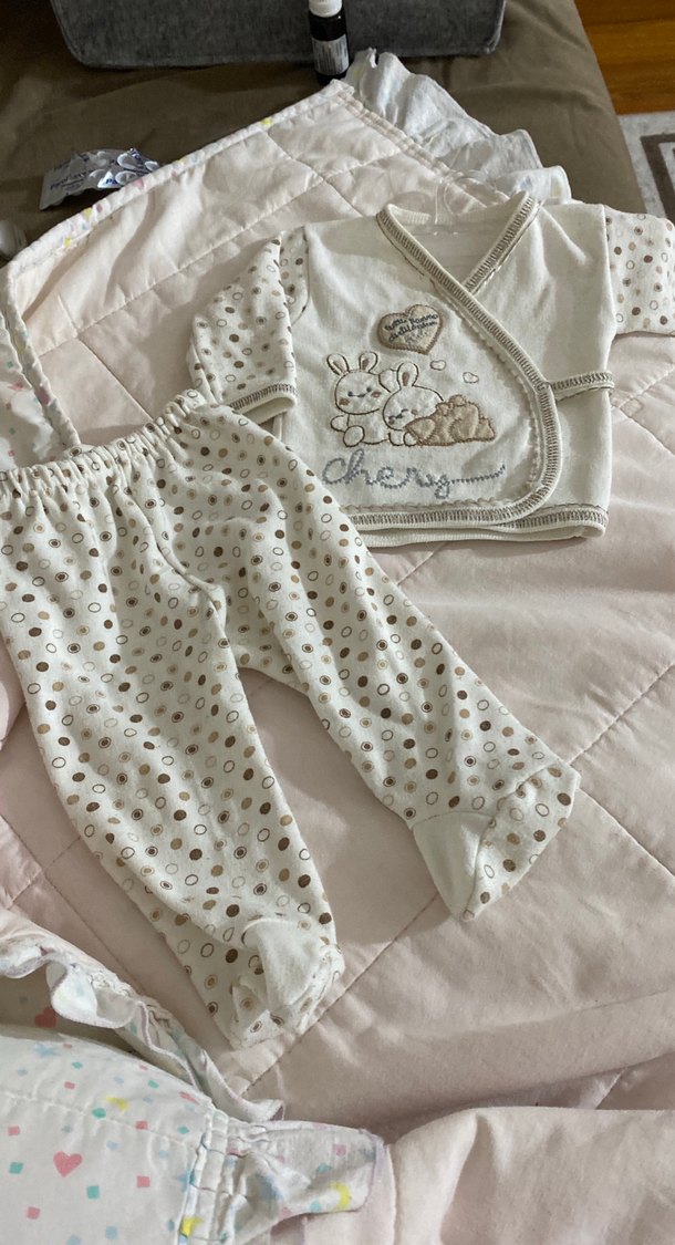 Uzun kollu, dantelli beyaz bebek kız takımı. Nakışlı tavşan desenli üst ve pastel desenli, ayaklı pantolon içerir.
