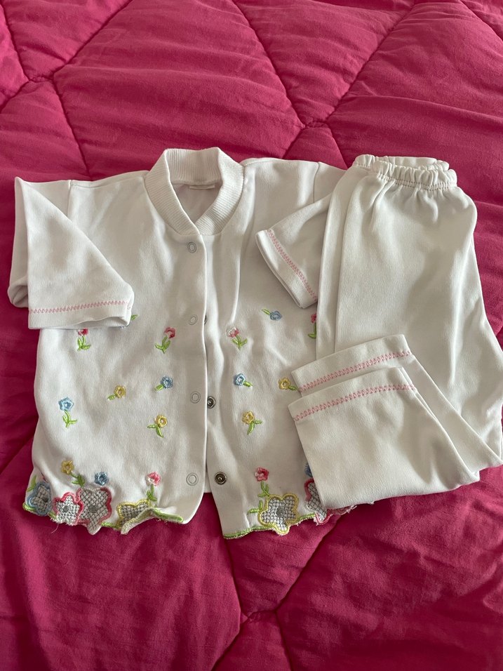 Uzun kollu, düğmeli, pastel renklerde çiçek nakışlı beyaz bebek kız takımı. Yumuşak ve rahat kumaş.