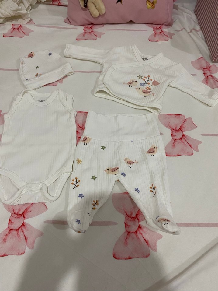 Uzun kollu, pastel renkli nakış detaylı, yumuşak ve pileli kumaştan oluşan beyaz bebek kız takımıdır.