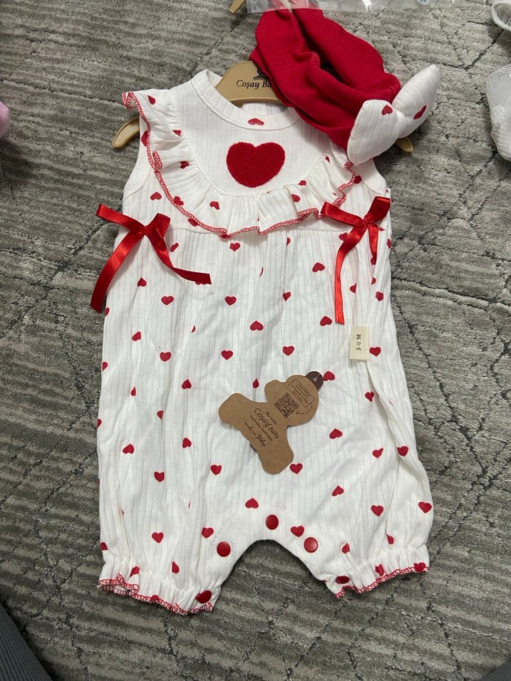Nakışlı kırmızı kalpler ve dantel detayları olan, yumuşak kumaştan yapılmış beyaz bebek kız tulumu. Kırmızı kurdele süslemeleri ve uyumlu kırmızı saç bandı içerir. ❤️