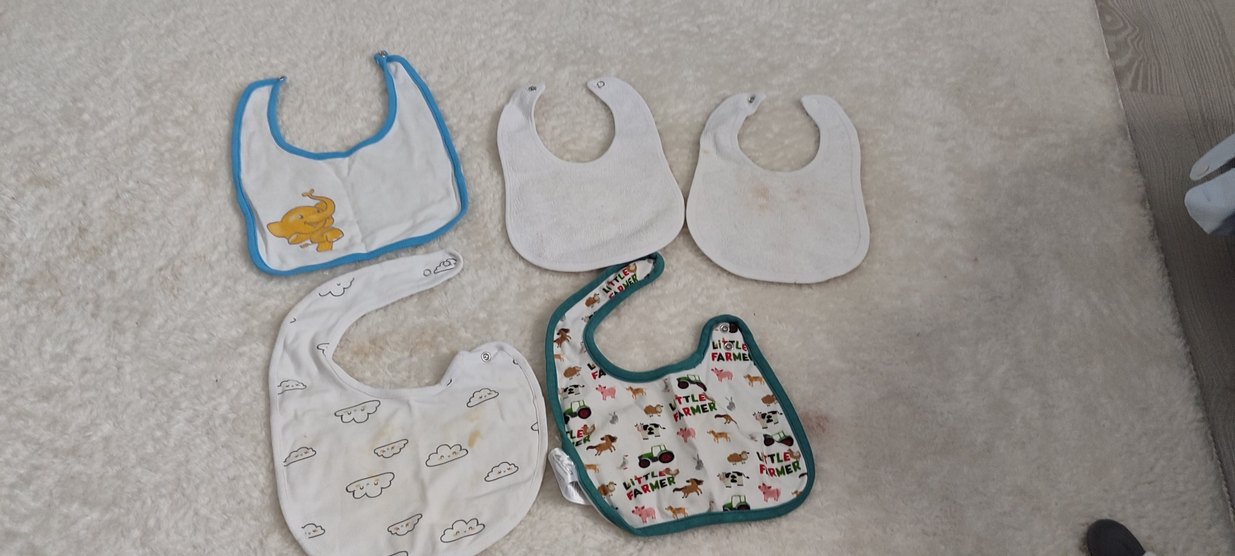 Nakışlı renkli desenler ve "LITTLE FARMER" yazılı beyaz bebek önlükleri. Bebekler için yumuşak kumaş.