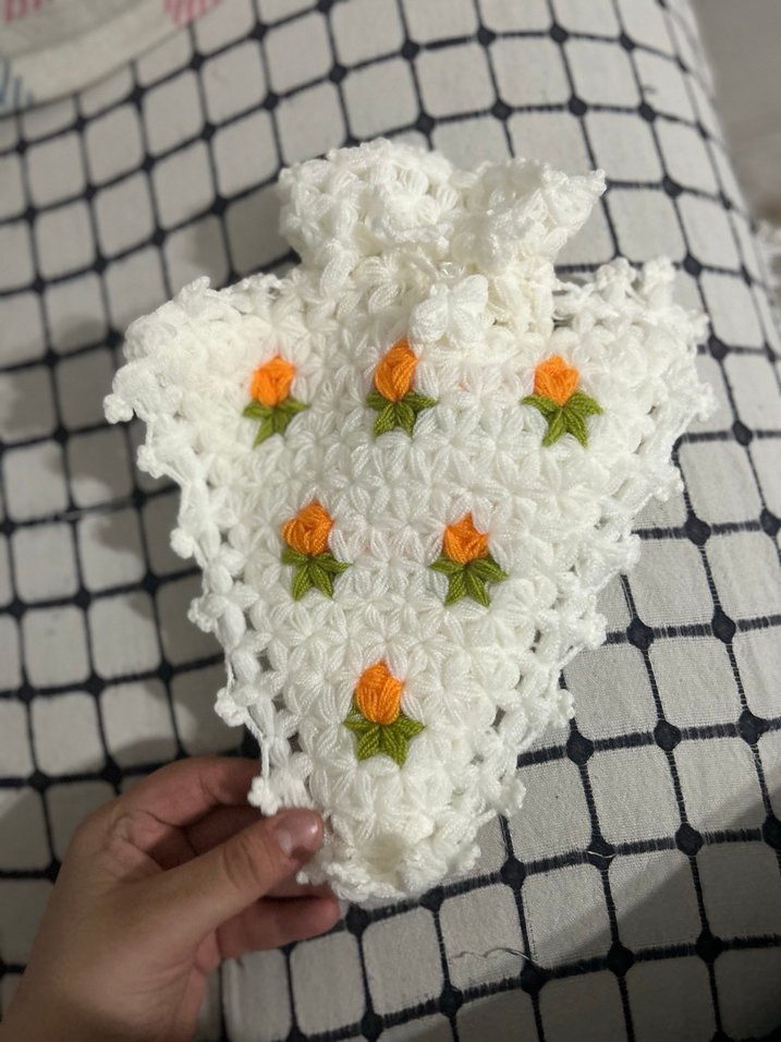 Bu beyaz bebek önlüğü, narin turuncu ve yeşil nakışlı çiçek desenlerine sahiptir. Yumuşak ve dokulu kumaştan üretilmiştir.