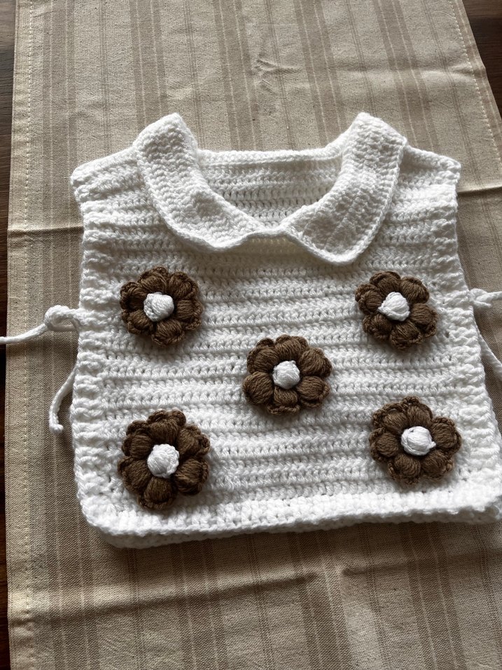 Yumuşak dokulu, yakalı beyaz bebek önlüğü, kahverengi nakışlı çiçeklerle süslenmiş. Yanlarda ayarlanabilir bağlama detayları bulunur. Sıfırdır, istenilen yaşa göre yapılır.