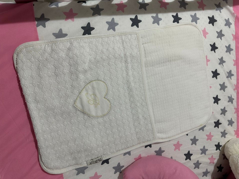 Yumuşak sentetik kumaştan, nakışlı kalp detaylı beyaz bebek uyku aksesuarı, pastel yıldız desenli. Alt değiştirme ve bataniyesiyle beraber takım hiç kullanılmadı