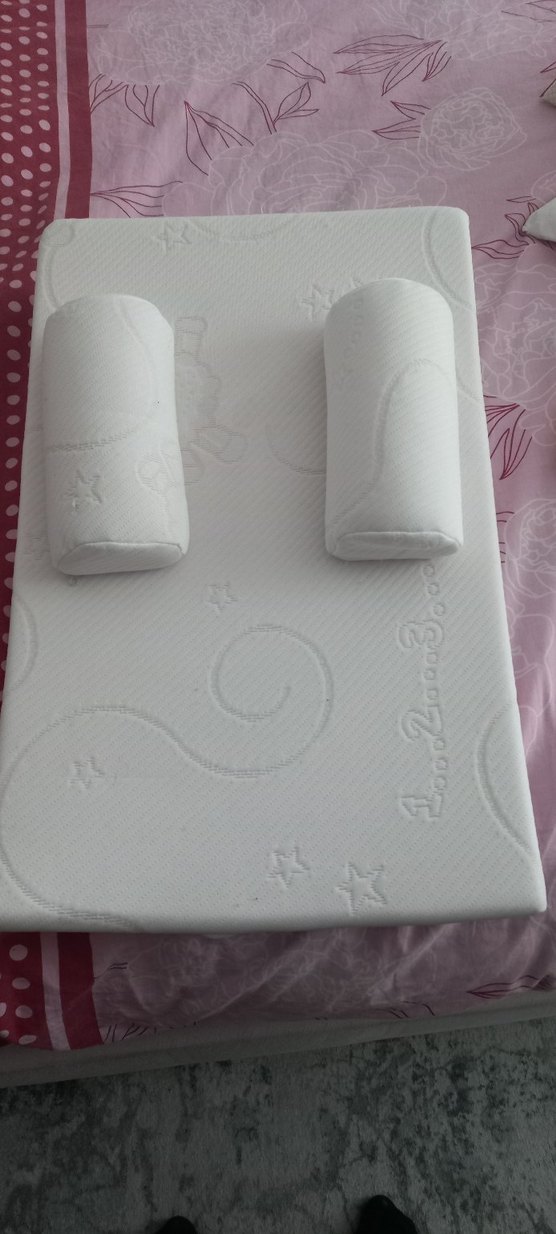 Nakışlı pastel desenlere sahip beyaz bebek uyku minderi ve destek yastıkları, yumuşak sentetik kumaştan üretilmiştir. ️