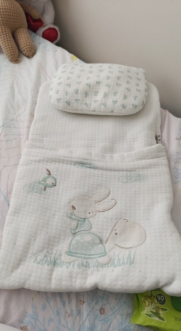 Yumuşak sentetik kumaştan yapılmış beyaz bebek uyku seti, pastel nakışlı hayvan desenleriyle birlikte yastık ve battaniye içerir.