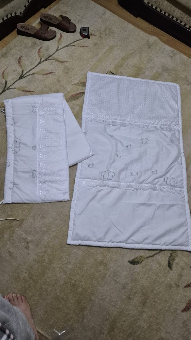 Beyaz ve gri tonlarda, yumuşak pamuk kumaş elyaf dolgulu üzerine nakışlı detaylara sahip bebek uyku seti.