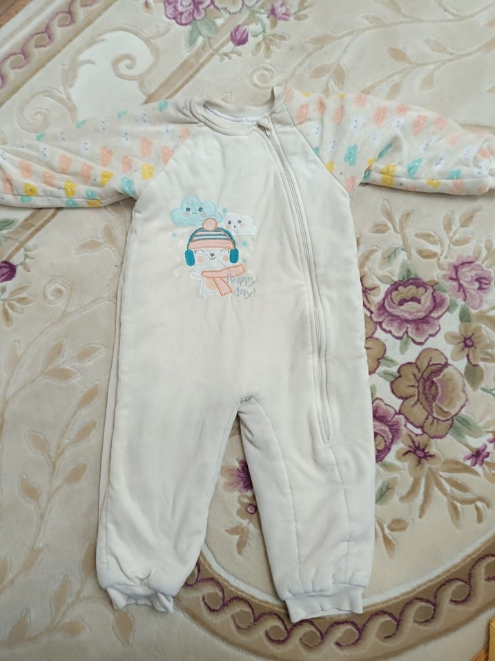 Pastel renkli nakışlı kolları ve yumuşak, sıcak kumaşı olan beyaz bebek uyku tulumu. Ön fermuarlı ve sıcak tutan manşetlere sahip.