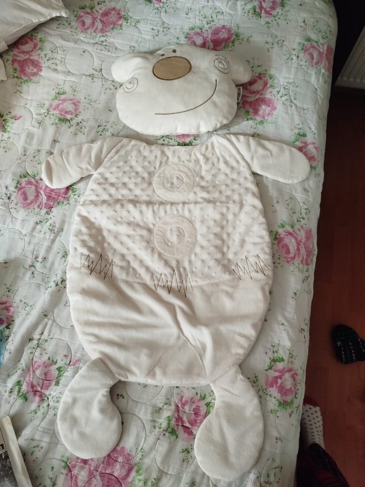Nakışlı detaylara sahip, yumuşak ve sıcak dokulu beyaz bebek uyku yatağı, rahat uyku için idealdir.