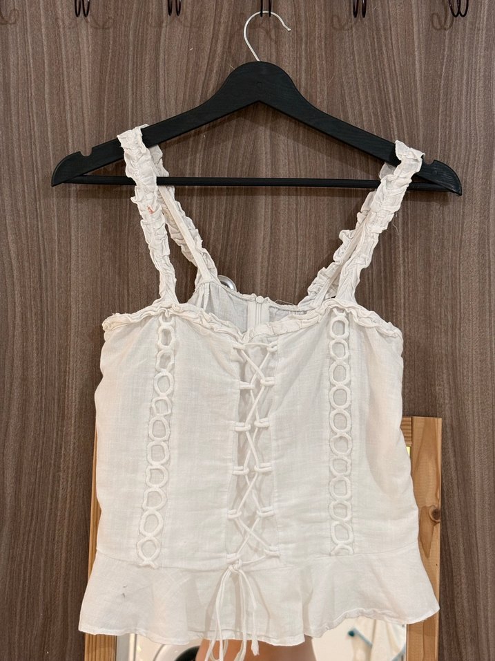 Nakış işlemeli, pastel beyaz renkli, midi uzunlukta ve vücuda oturan hemşire korsesi. Fırfırlı askıları ve ön kısmında bağcık detayı bulunur.