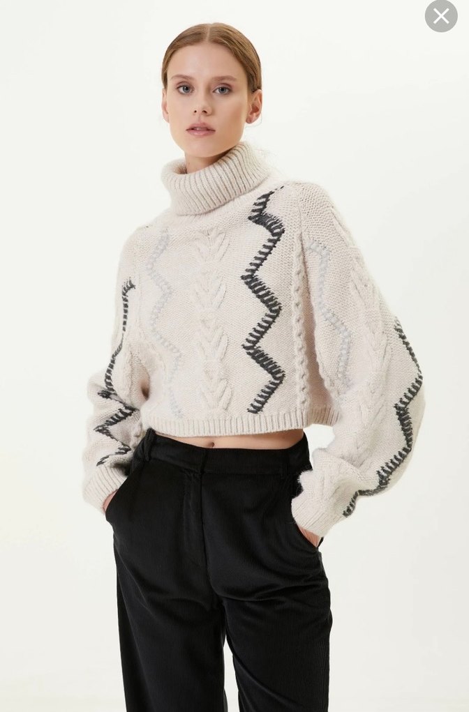 Nakışlı gri desenlere sahip beyaz, boğazlı, bol kesim kısa triko kazak. Uzun kollu ve rahat sokak tarzı için uygun. Birkaç kez giyildi. Manuka suud emnora touche kadriye baştürk heqa koton network