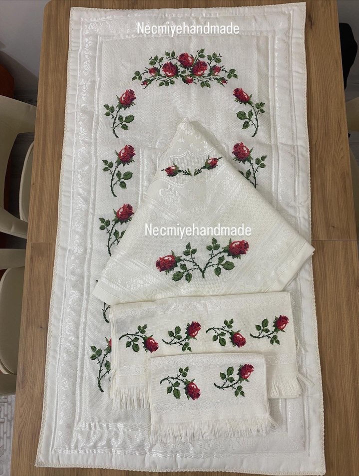Nakışlı kırmızı gül desenleri ve püsküllü kenarları olan beyaz bohça seti, geleneksel ve zarif bir tasarıma sahiptir.El emeğidir