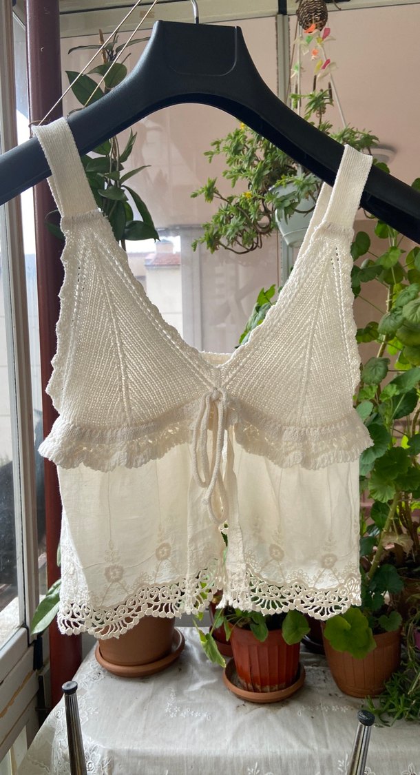 Nakışlı detaylara ve ön bağlamaya sahip beyaz bohem bralet, hafif ve ferah bir his sunar.
