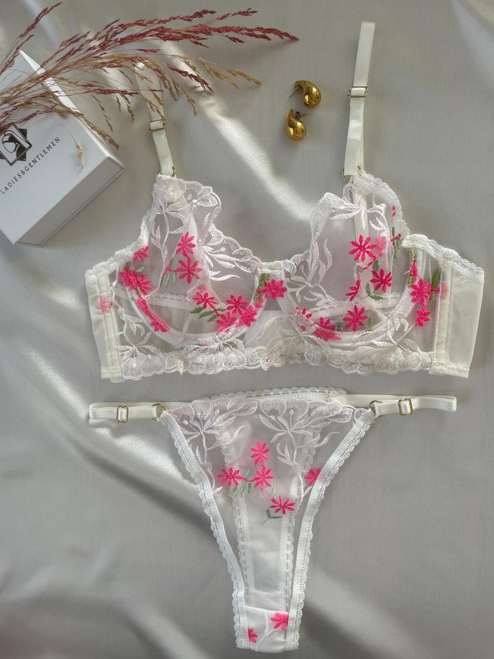 Beyaz renkte, pembe çiçek nakışlı, bohem tarzda, ayarlanabilir askılı sütyen ve külot takımı. Hafif ve şık bir tasarıma sahiptir. bedenleri mevcuttur. Bir beden büyük alınız