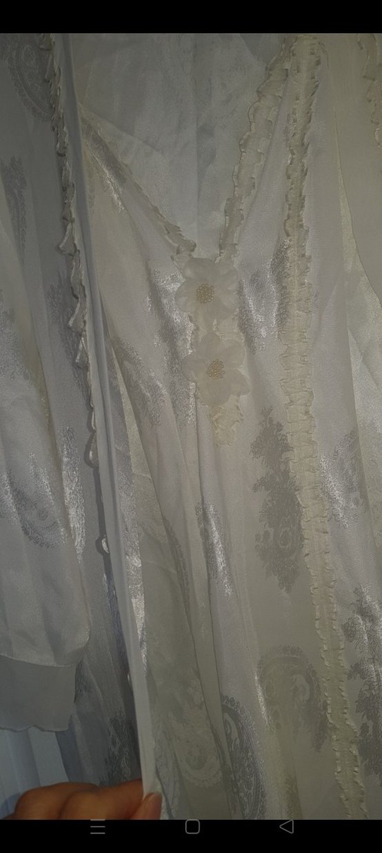 Nakışlı desenlere sahip beyaz bohem Uzun gecelik?, uzun sabahlık, pijama alt üst takım. beden uymadığı için hiç giyilmemiştir. çok kaliteli bir takımdır..