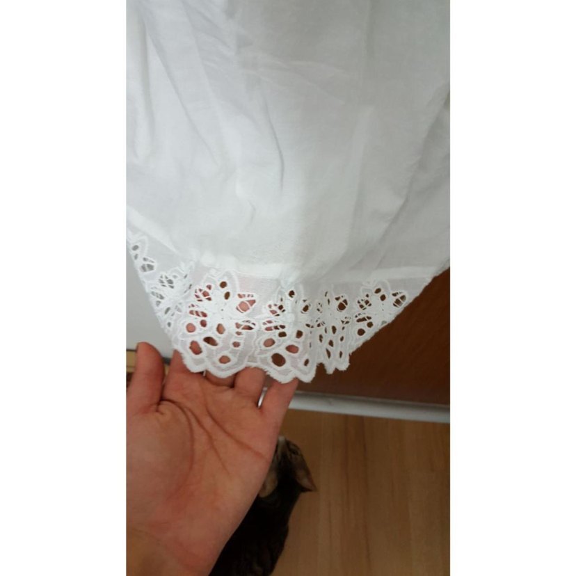 Nakışlı fırfırlı beyaz pamuklu, bol kesim hamile eteği. Bohem tarzda, midi boy ve düğünler için uygundur.