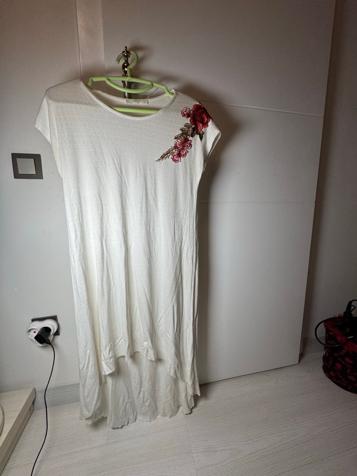 Beyaz renkte, kısa kollu, yuvarlak yakalı, bol kesim hamile tunik. Bohem tarzda drapeli ve nakışlı detaylara sahiptir. Günlük kullanıma uygundur.