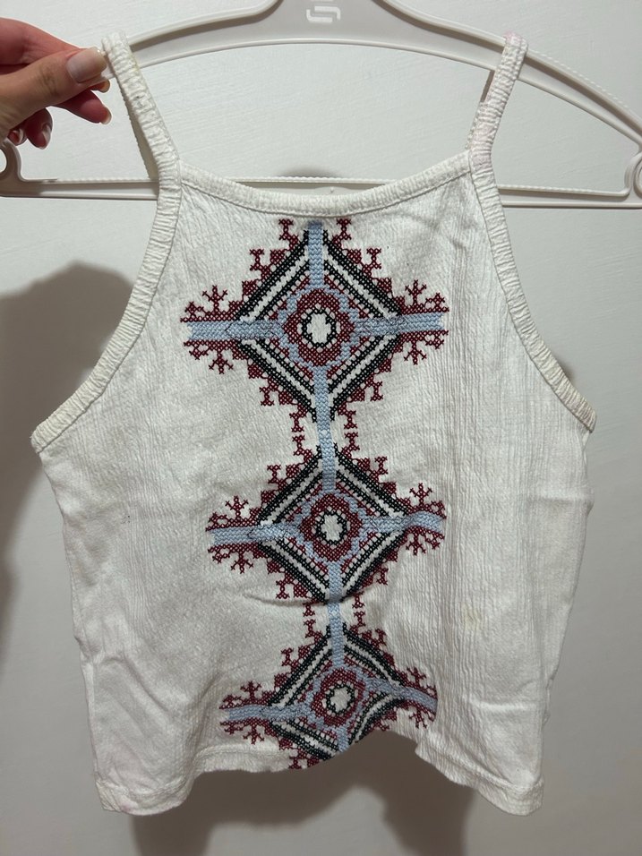 Nakışlı ve boncuk işlemeli, beyaz, bohem tarzda kadın atlet. Kolsuz ve normal midi boyda, günlük kullanıma uygundur.