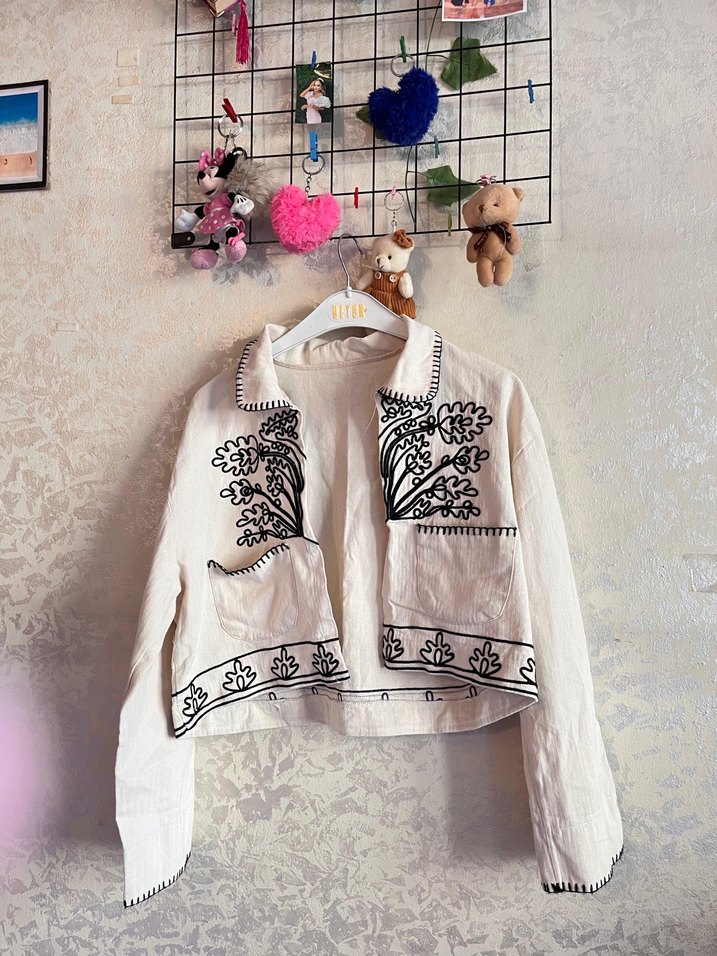 Düğmeli, yakalı kısa beyaz ceket. Siyah nakışlı desenlerle süslenmiş, bol kesim ve tekstil kumaştan yapılmıştır. Günlük kullanıma uygun.