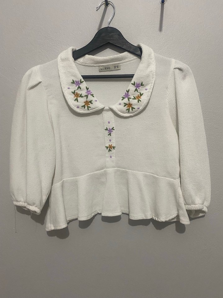 Uzun kollu, yakalı beyaz örme kadın gömlek, zarif çiçek nakışlı. Düğmeli ve bol kesim, bohem tarzı için uygun.