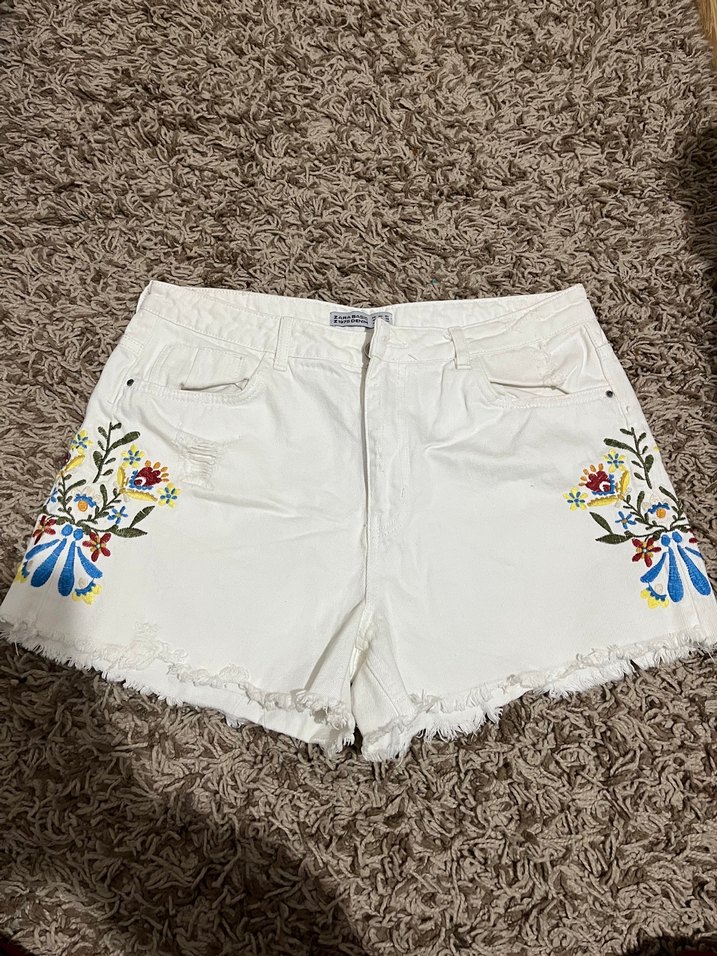Pamuklu, bol kesim beyaz mini kot şort, nakışlı çiçek desenleri ve düğmeli kapanışa sahip, bohem tarzda. Sert kumaşı vardır esneme yapmaz