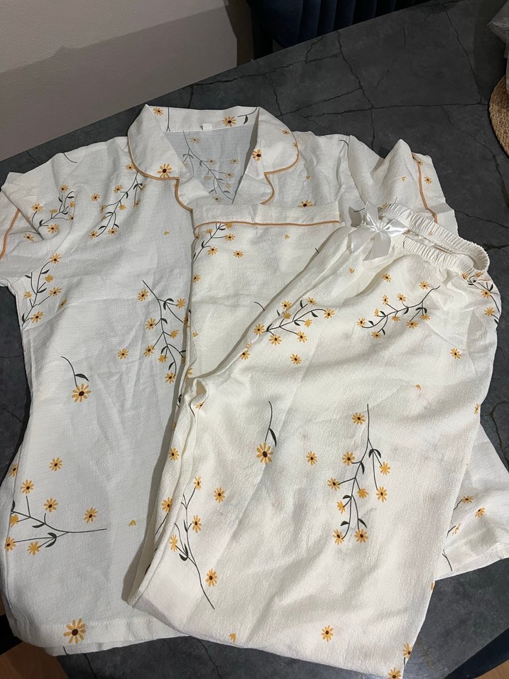 Nakışlı çiçek desenleriyle süslenmiş beyaz bohem tarzı kadın pijama takımı, kısa kollu ve bol kesimdir. Midi boyuyla rahatlık sunar.