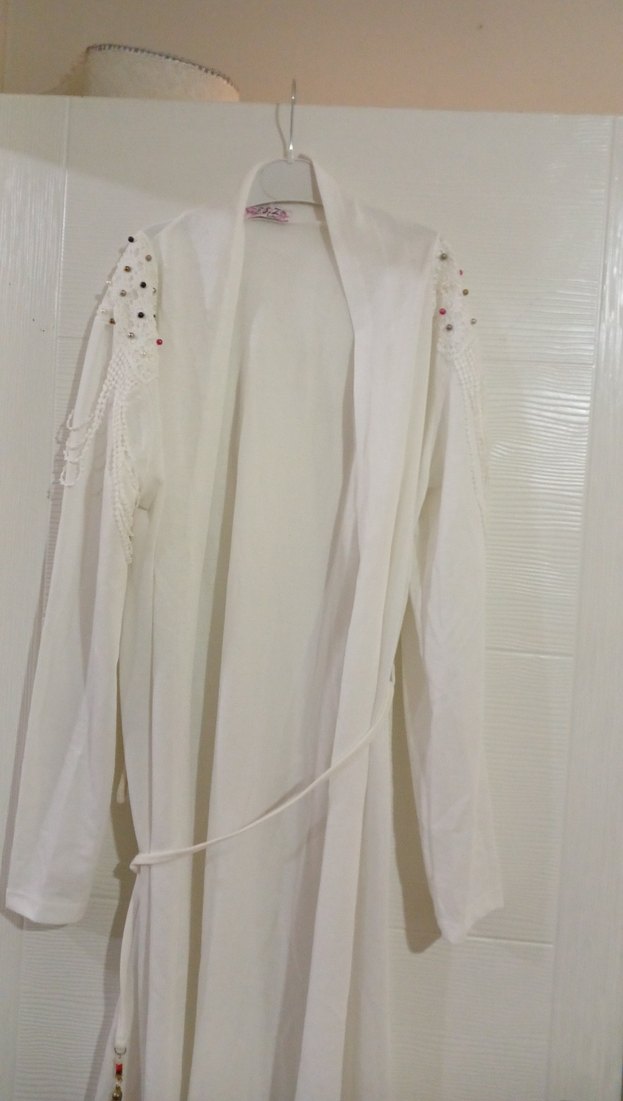 Bu beyaz bohem tarzı kadın uzun elbise, uzun kollu ve bol kesimdir, nakışlı detaylarla hafif ve şık bir görünüm sunar.