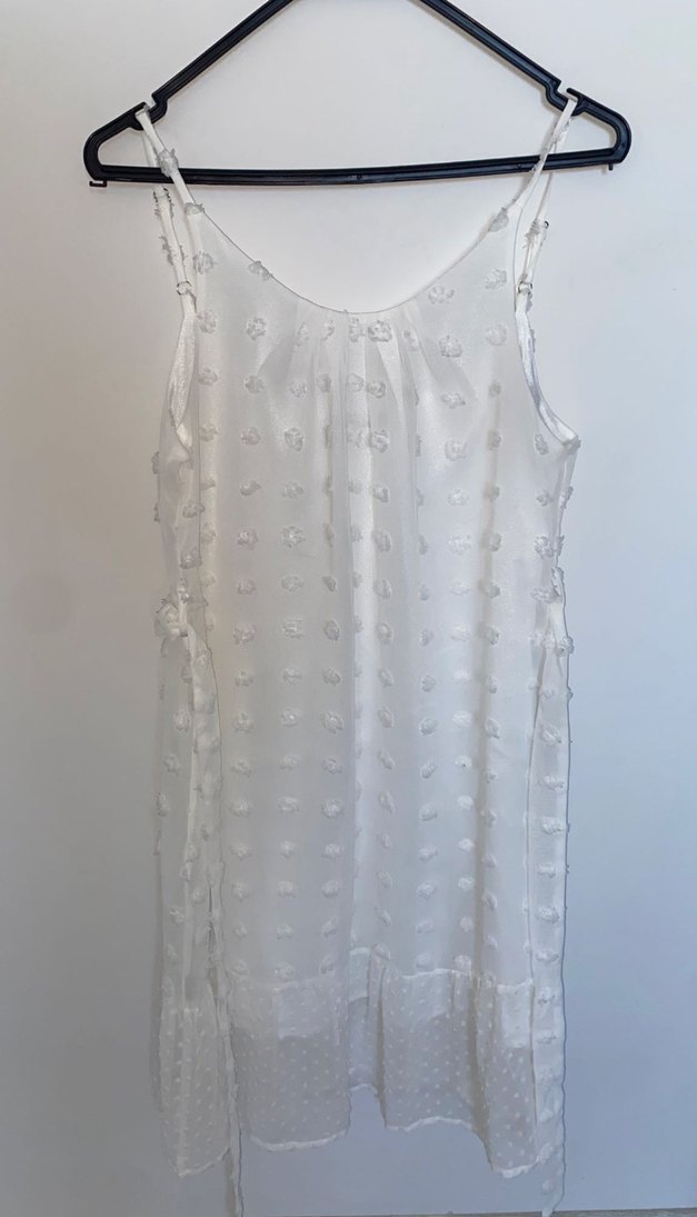Nakışlı detaylar ve fırfırlı süslemelerle beyaz, kolsuz uzun elbise. V yaka ve bol kesim bohem tarzda, yumuşak sentetik kumaştan yapılmıştır.